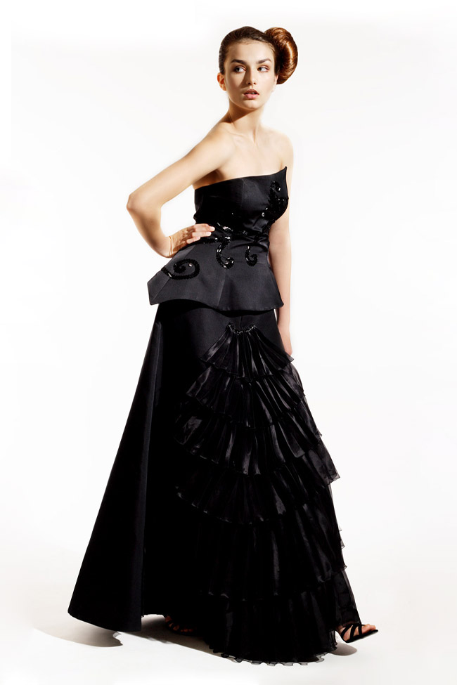 Bustier in black pure silk duchesse satin, with asymmetric peplum. Beaded and crystalized ramage at front and peplum. A-line skirt with silk organza jeweled pleated frills at front.