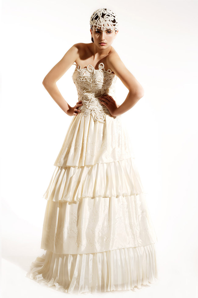 Bridal: Antique white, Christine Kostoff Atelier graphic lace overlay. Silk, fitted bustier. Pleats and frills skirt, with beads and crystals embroidered ramage. Head piece in graphic lace, Christine Kostoff Atelier.