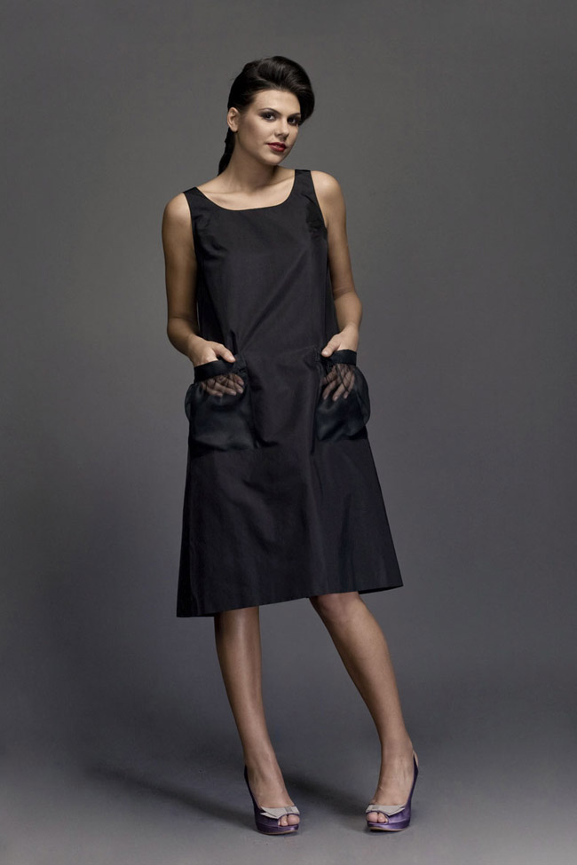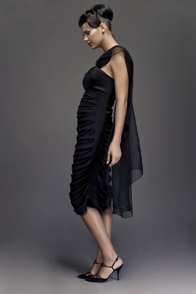 Black silk cady cocktail dress,with pleated overlay and silk chiffon toga.