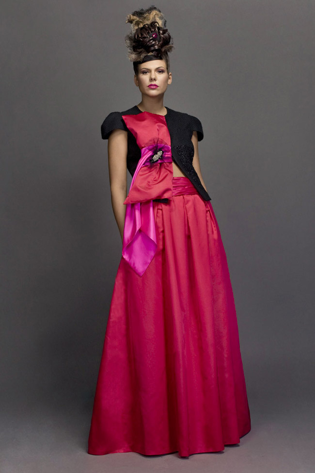 Strawberry and black ballgown. Wool jacket with giant faille bow appliqué, with silver broche and Swarovski elements. Full skirt in faille, pleated at waistline.
