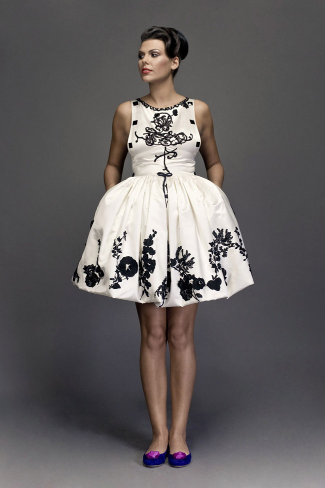 Mini, cage shaped dress in white faille, with embroidered details. Swarovski elements.