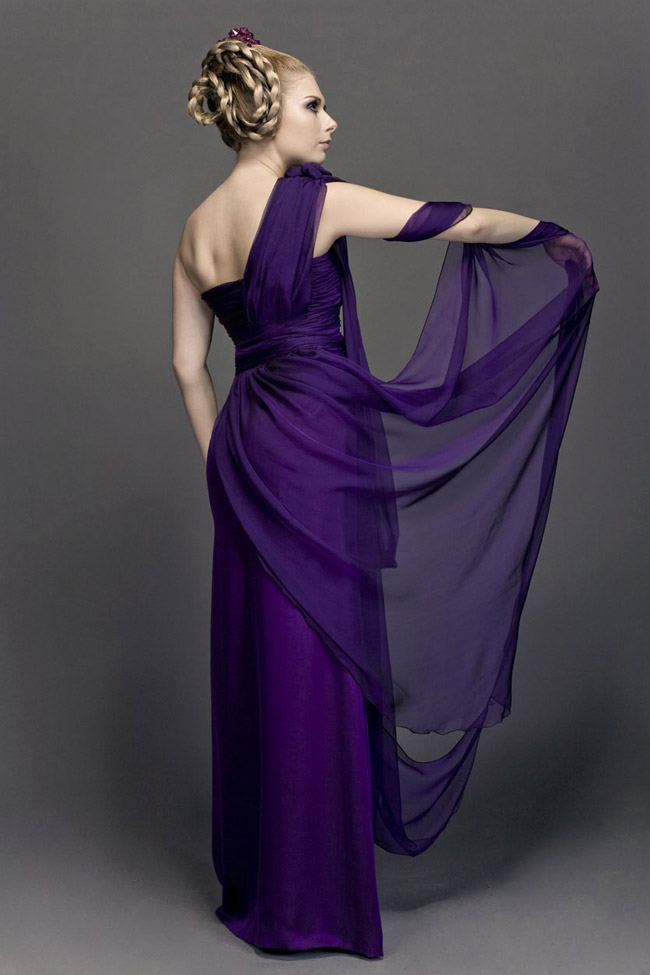 Aubergine silk chiffon ballgown. Pleated bust and draped overlay.