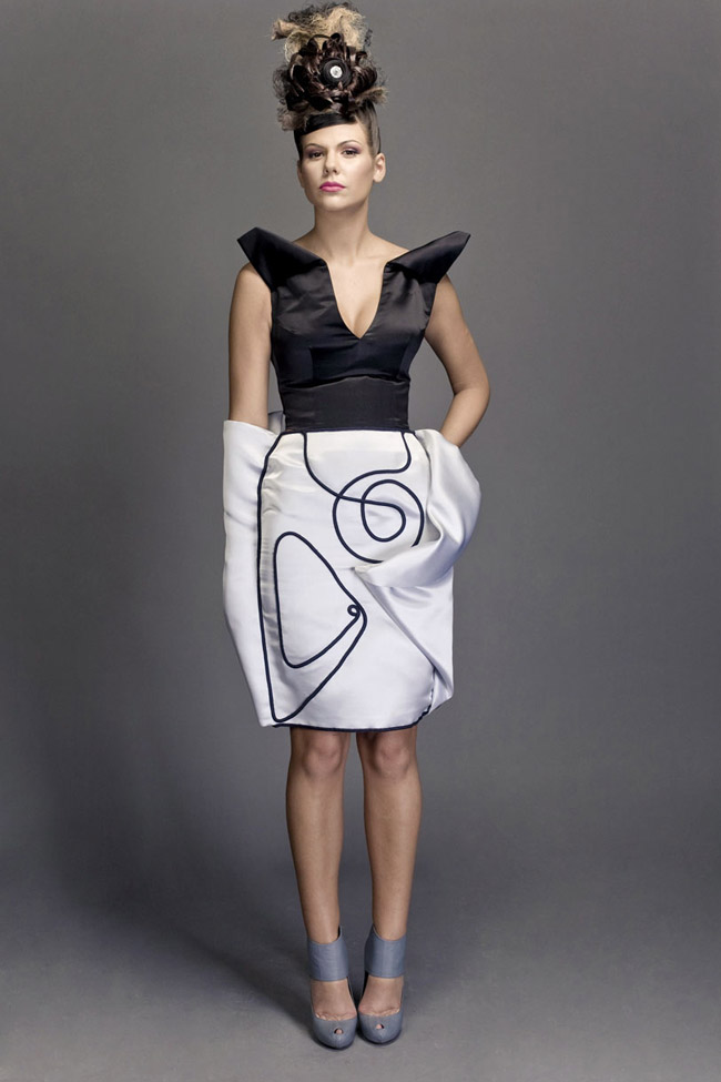 White, pure silk crêpe-satin A-line gown, with black silk organza overlay, accented with black leather belt at high bust. Bib with Swarovski cabochons.