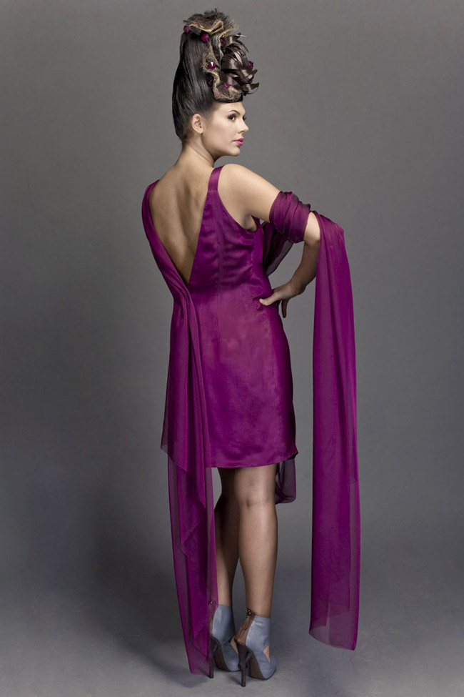 Purple, pure silk duchesse satin skirt, with rutched and pleated overlay. Bow details and Christine Kostoff signature at front skirt(gold brushed piece, Christine Kostoff contemporary jewellery).Man's shirt with oversized collar.