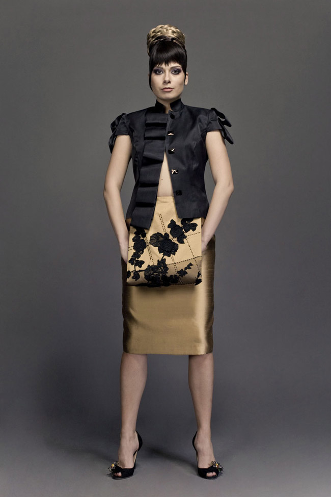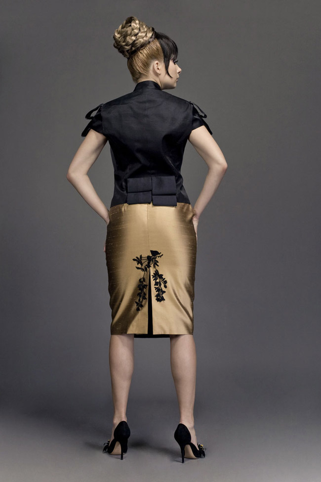 Pure silk, black shantung “Military” jacket. Épaulettes accented with pleated silk tulle. Pleated peplum. Transparent back, in black silk tulle. Gold brushed buttons. Gold silk gabardine skirt, with pleated overlay, accented at front with Swarovski elements detail (a braid made of ribbon and Swarovski pearls and mesh).