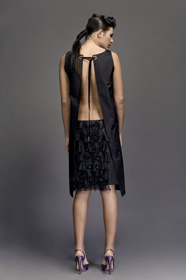 Black taffetas sarafan with open back. Pencil skirt with embroidered ruffles at back. Swarovski elements.