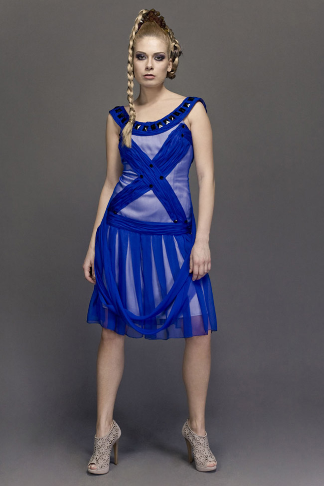 Ink blue mousseline, low cut cocktail dress, with Swarovski elements over pleated details.