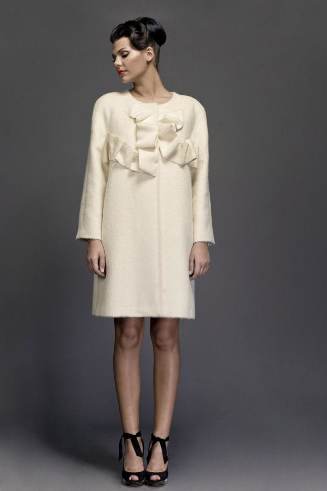 Ecru alpaca coat with ruffle effect details at front and back.