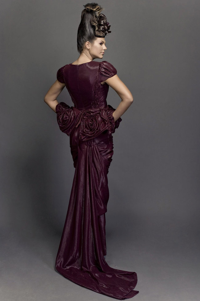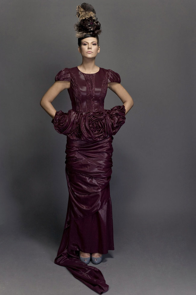 Burgundy coated silk. Pleated on bust and sleeves.Tutu peplum pleated with giant roses. Draped full skirt, with train.