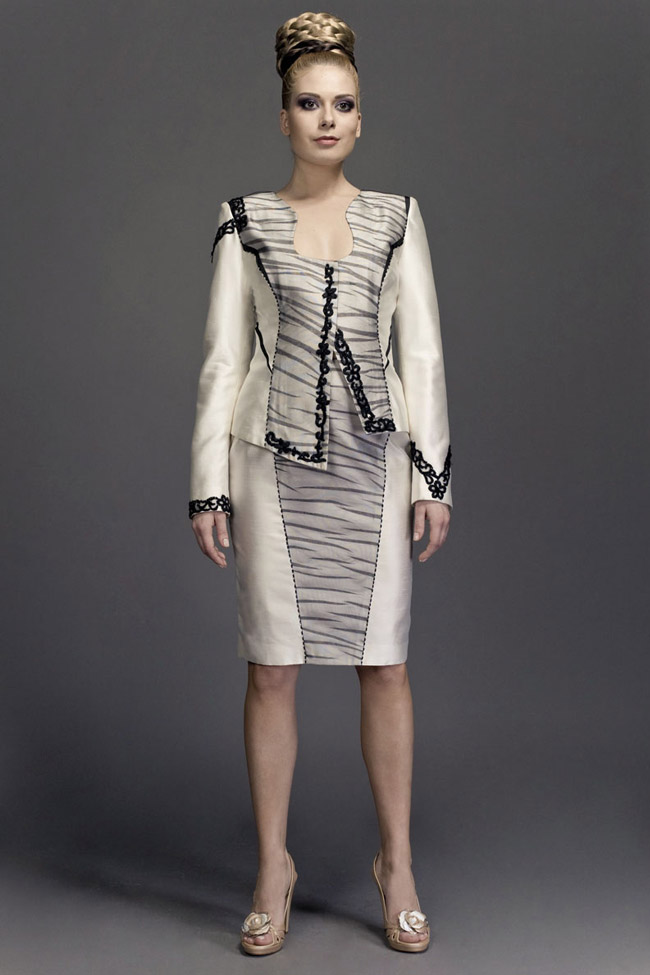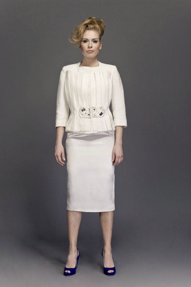 White linen and silk jacket with pleated overlay and crystals detail at waistline. Pencil skirt in white silk crêpe-satin.