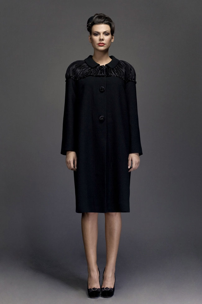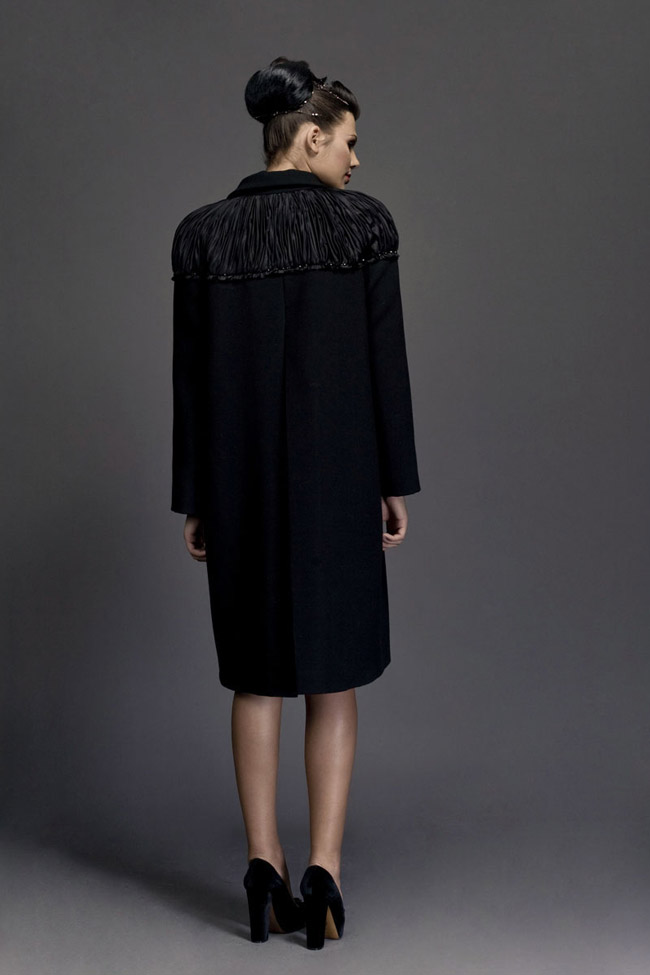 Black linen and silk robe manteau, with organza sleeves cuffed with crystals. Pleated épaulettes. Swarowski crystals buttons.
