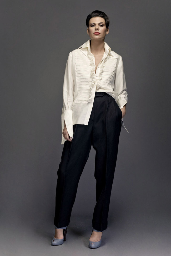 Ivory silk shirt, double collared, pleated on bust and ruffle trimmed. Man's pants with high waist and cuffs.