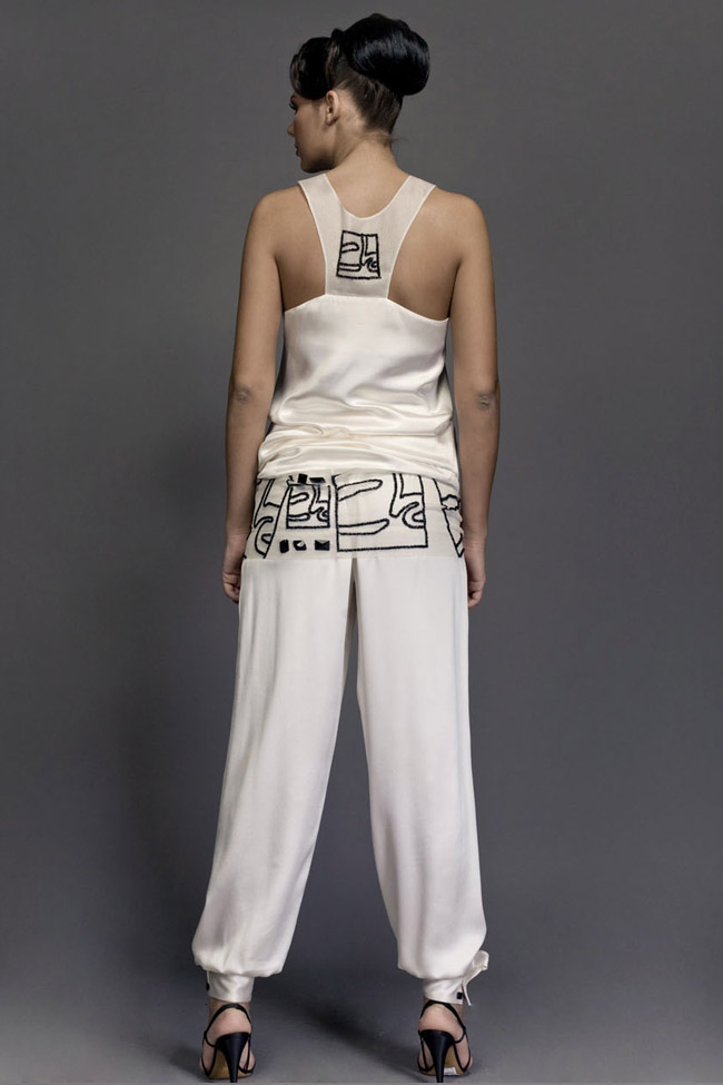 Top in black organza, dévoré effect bead embroidered at front. Beads fringes at halter neck. Pants in ivory silk, with black beaded piping.