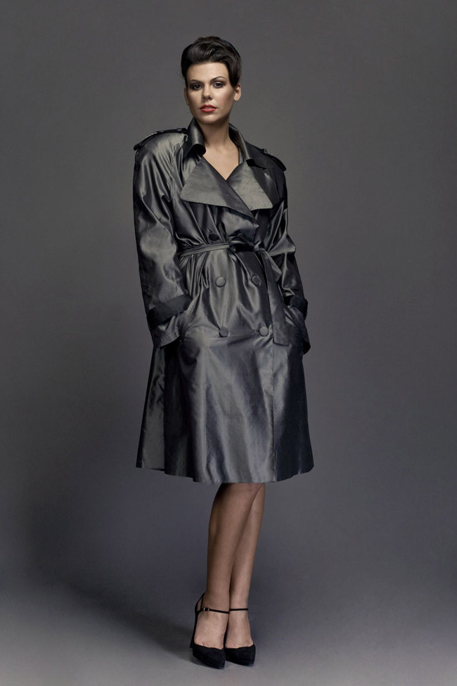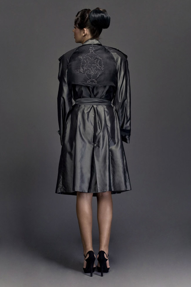 The trench in anthracite glacé taffetas with Swarovski elements embroidered detail on back.