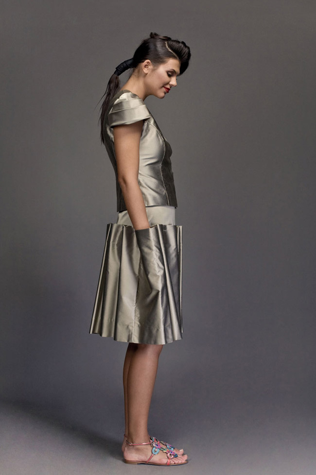 Mystyrose, pure silk taffetas jacket. Entirely pleated striking collar and lapels. Oversized pleated rose on bust and peplum. Pleated details at sleeves. Pure silk, black organza skirt, with pleated overlay. Christine Kostoff Contemporary Jewelry necklace in sculpted 925 sterling silver, with Swarovski pearls and silver chain detail.