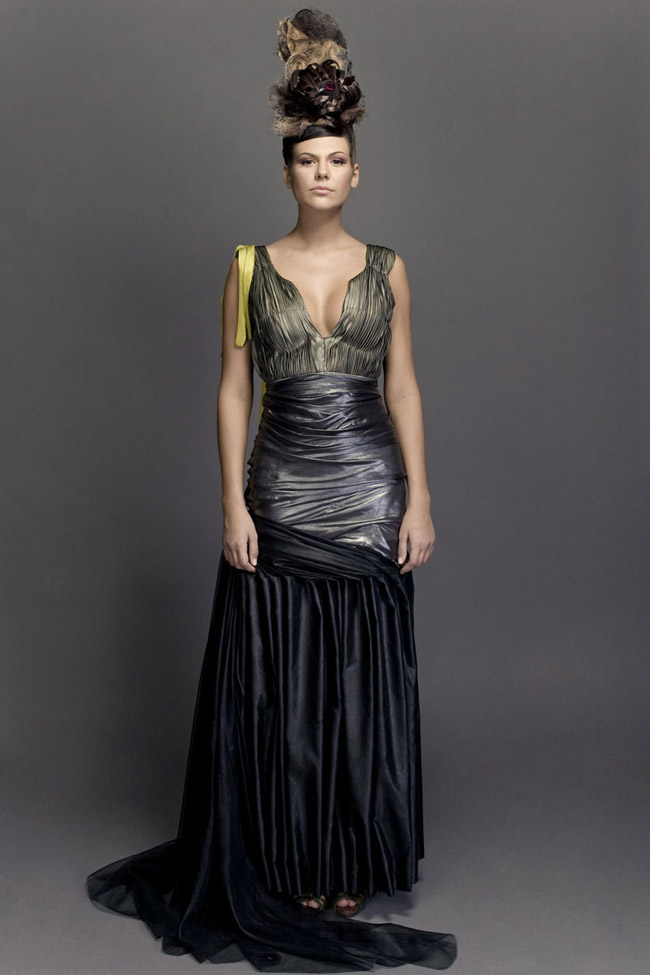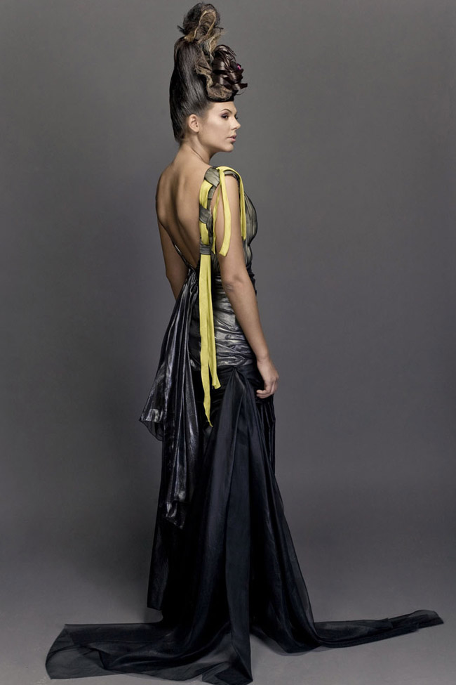 Ballgown with double layered hand pleated bust,skirt draped in anthracite glacé silk mousseline,with "accordion"pleats overskirt. Chartreuse silk ribbons braided on low cut back.