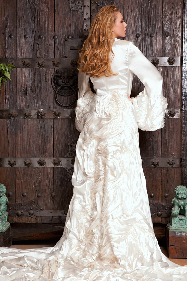 White silk duchesse satin robe bustier. Giant bow with jeweled detail at front.