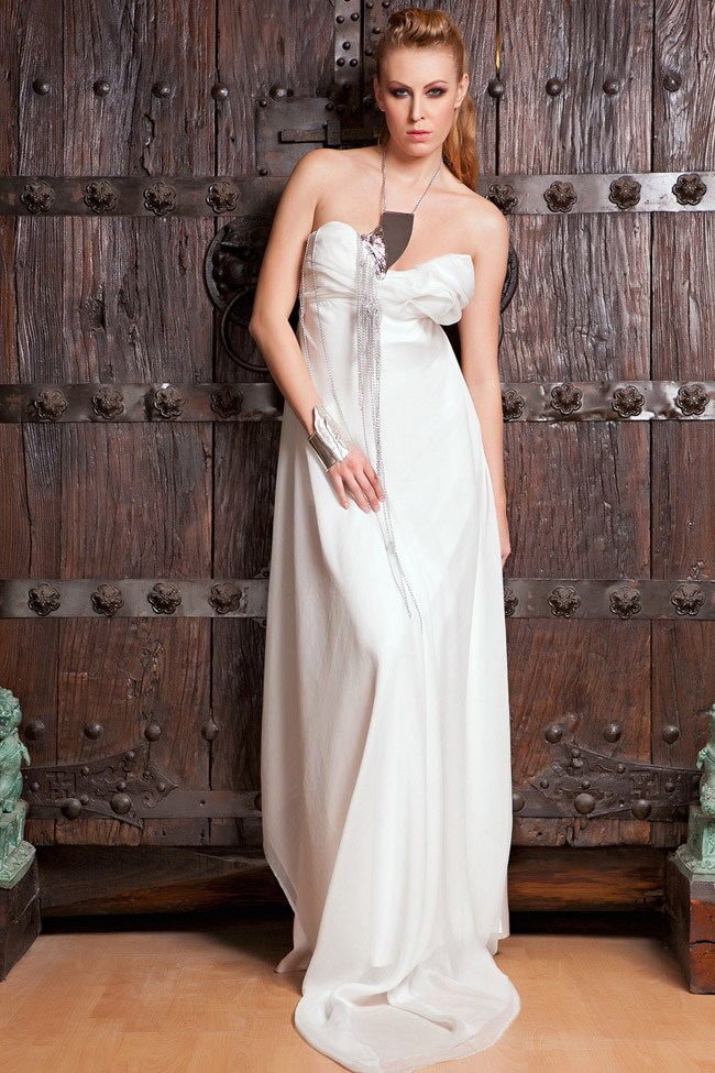 Floral white, mousseline gown, accented with Christine Kostoff 925 sterling silver contemporary jewelry at pleated high bust. Bracelet manchette in sculpted 925 sterling silver, Christine Kostoff Atelier.
